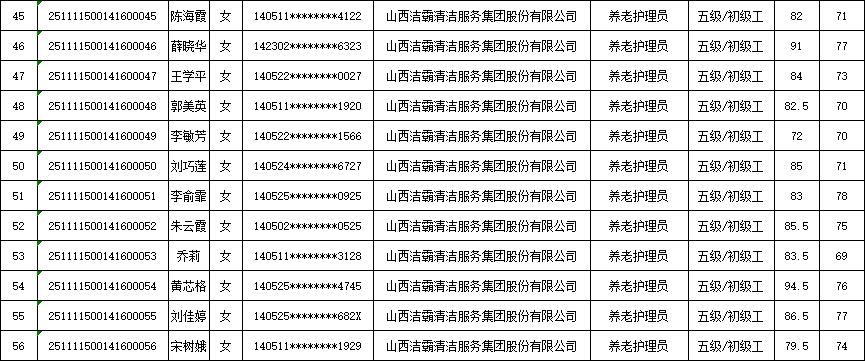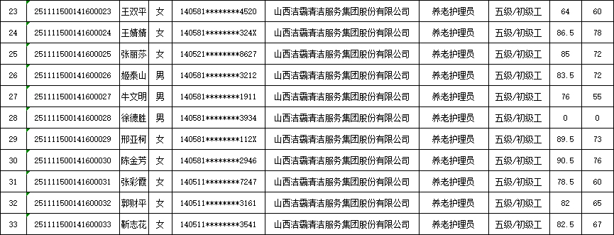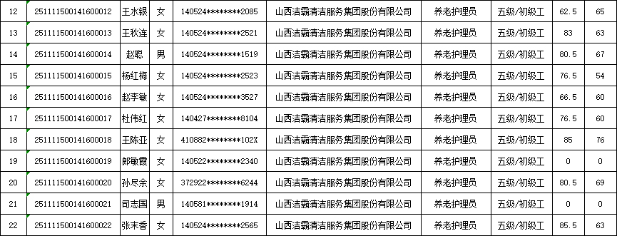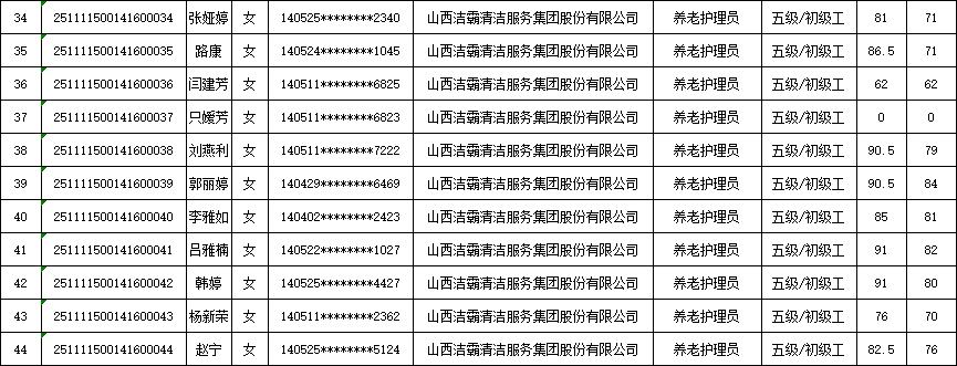 山西潔霸清潔服務(wù)集團股份有限公司職業(yè)技能等級認(rèn)定中心現(xiàn)將2025年11月15日認(rèn)定人員成績公示如下:
